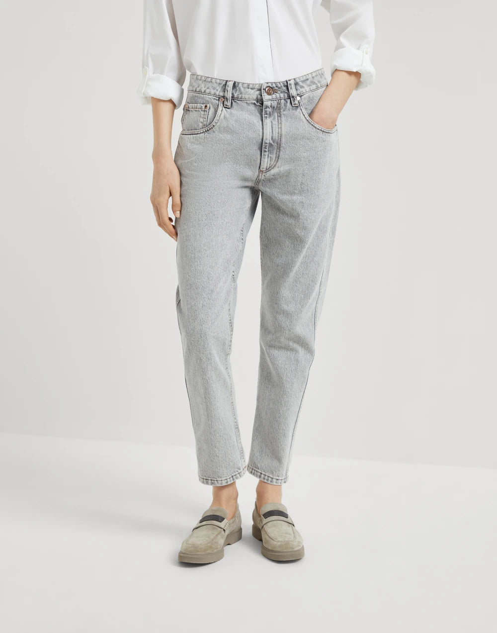 Essential, regular lines create a versatile, contemporary silhouette in these Authentic denim Straight trousers. On the back pocket, the iconic embellishment of the Brunello Cucinelli collections completes the garment with a feminine touch: the small label is embroidered in fine rows of sparkling monili.