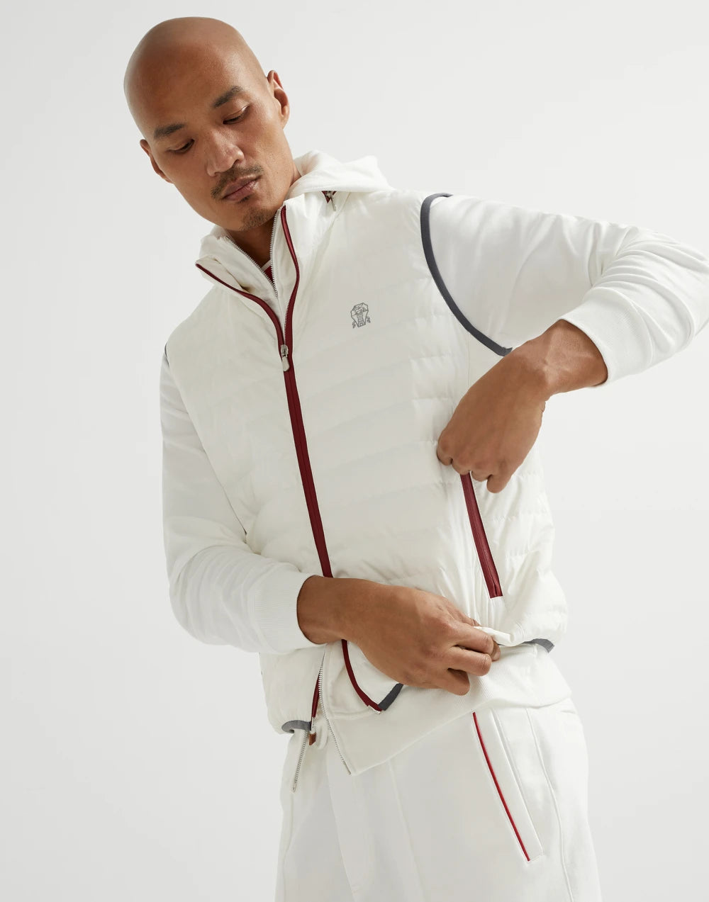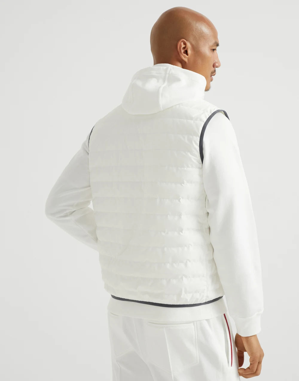The excellence of Brunello Cucinelli materials enriches the versatile style of this bonded nylon down vest, a part of the Travelwear line dedicated to relaxation and leisure. An ultra-lightweight fabric with a distinctly technical, sporty feel is combined with soft, lightweight filling made of high-quality goose down and feathers, making it perfect to wear in the spring over blazers, sweatshirts and sweaters. The practical snap closure and the removable hood accentuate the garment's comfort, while the Solomeo logo on the chest adds a personalized detail.