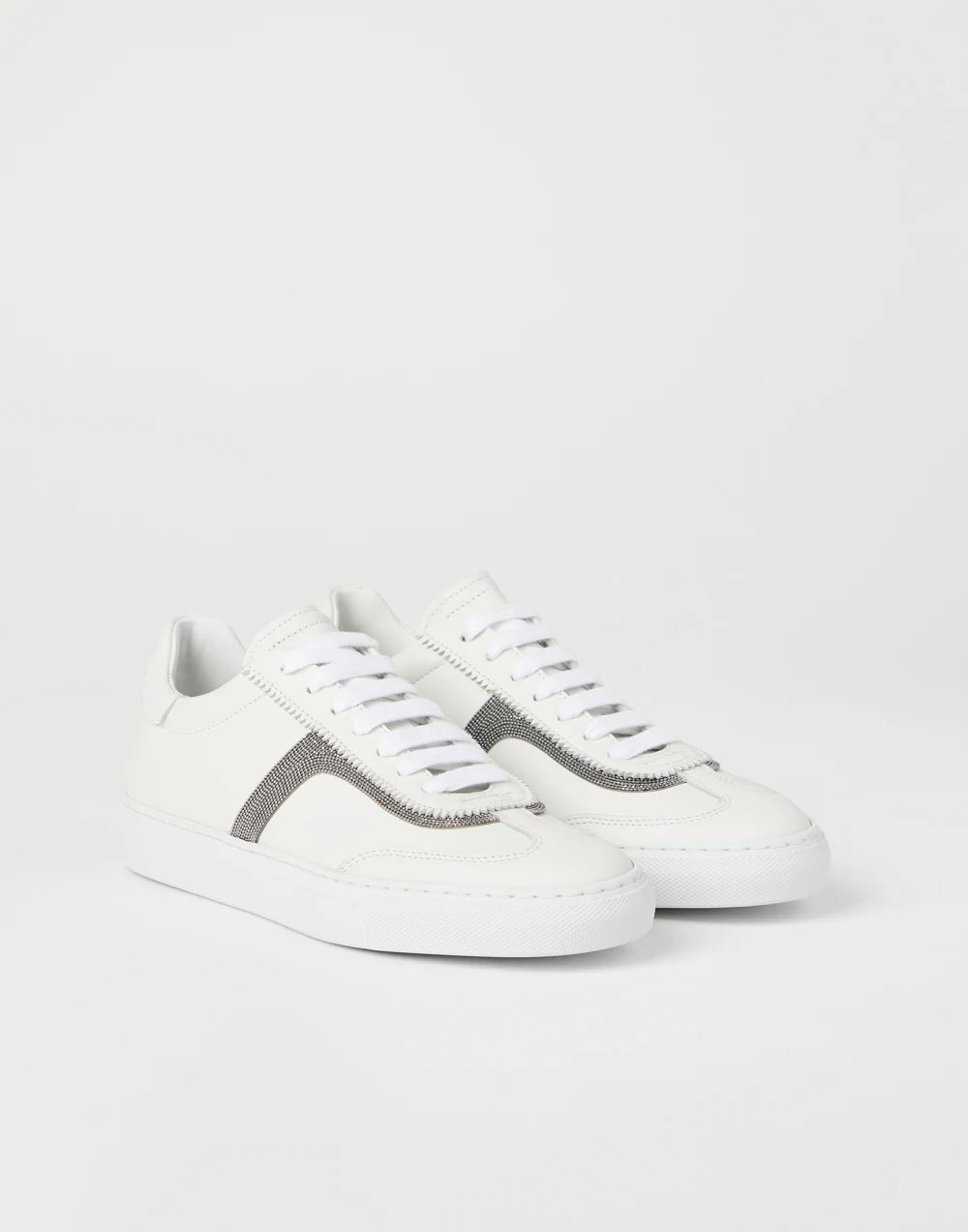 The sporty, essential allure of these sneakers is enriched with the iconic embellishment of the Brunello Cucinelli collections. An insert embroidered entirely with fine rows of shiny monili stands out on the sides, creating an elegant sparkling effect that enhances the refined leather’s smooth texture.