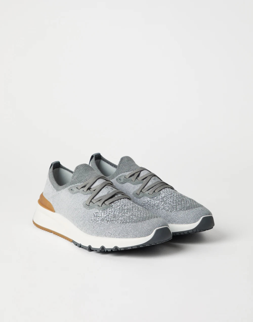 The classic yarns of Brunello Cucinelli knitwear inspire the elegant, sporty feel of these sneakers. The upper is made of a very lightweight, stretch chiné knit, which showcases a compact appearance on the sides with "micro-perforations" on the toe, a detail characteristic of sporty accessories. The elasticity of the knit guarantees an optimal fit and comfort.