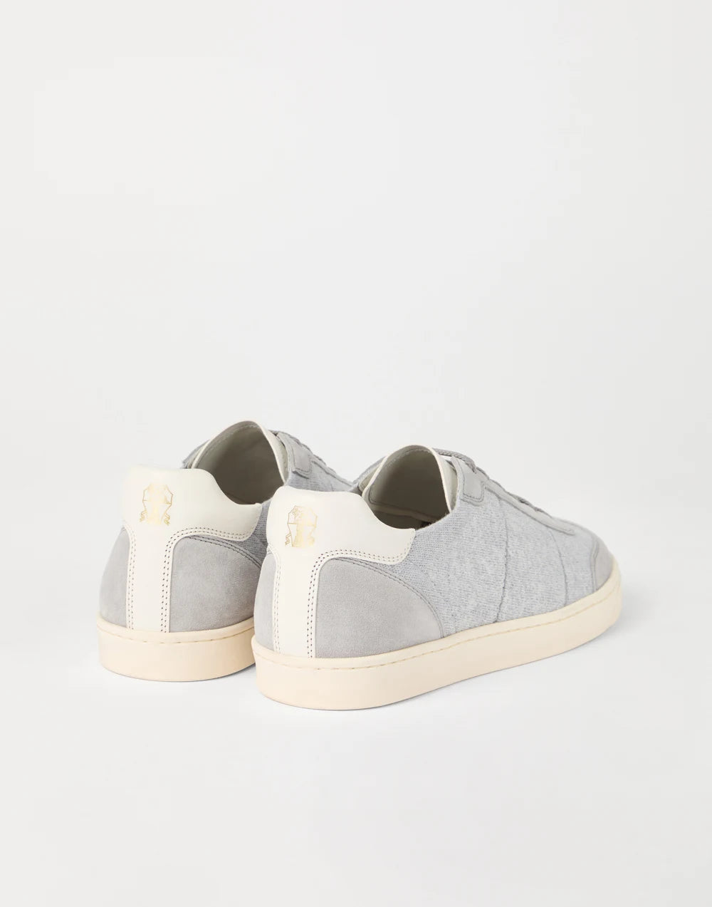 Inspired by the refined yarns of Brunello Cucinelli knitwear, these new pure cotton knit sneakers update the look of classic athletic styles in a modern, sophisticated way. The washed suede and Soft calfskin inserts stand out on the plush, tapered upper, enriching the footwear with a delicate contrast of textures and distinctive color effects. The sneakers are lightweight and unlined, except for the eyestays and tongue, ensuring greater durability.