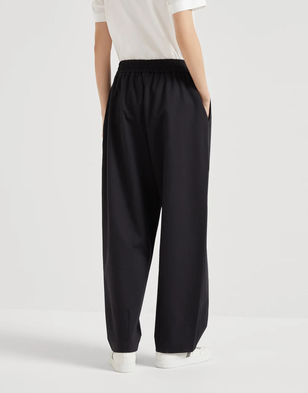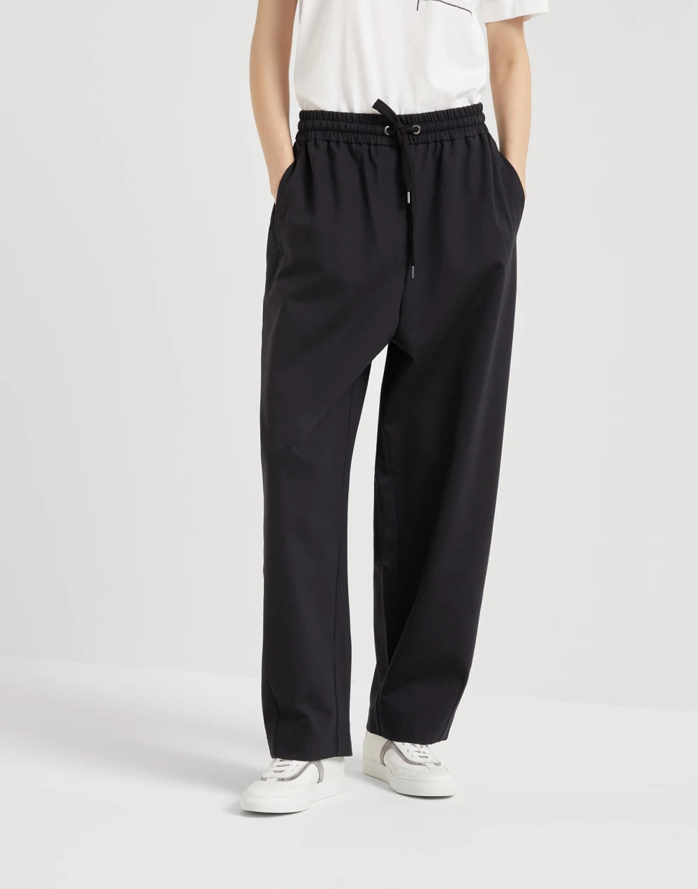 Refined Brunello Cucinelli materials are paired with the casual style of the Travelwear line, dedicated to moments of relaxation and leisure. These new couture interlock Track trousers combine a sporty feel and an informal yet elegant texture. The relaxed, comfortable silhouette is enhanced by the drawstring waist detail.