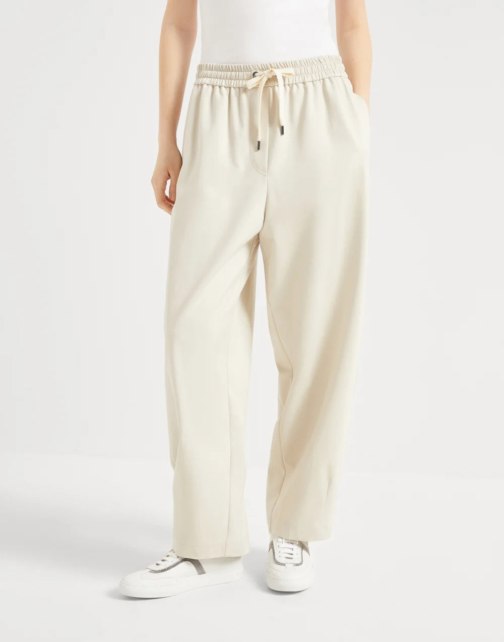 Refined Brunello Cucinelli materials are paired with the casual style of the Travelwear line, dedicated to moments of relaxation and leisure. These new couture interlock Track trousers combine a sporty feel and an informal yet elegant texture. The relaxed, comfortable silhouette is enhanced by the drawstring waist detail.