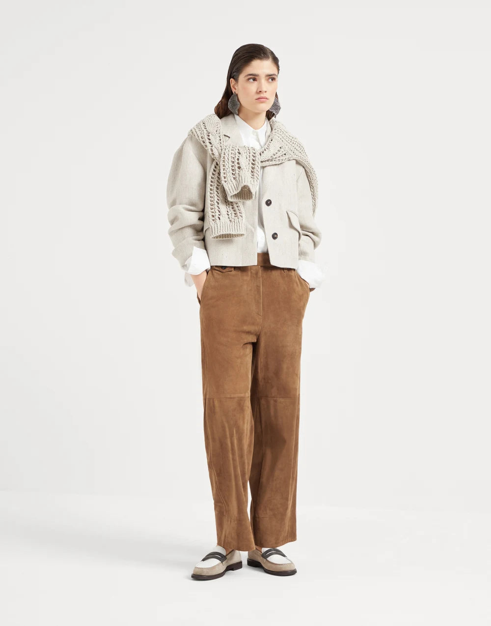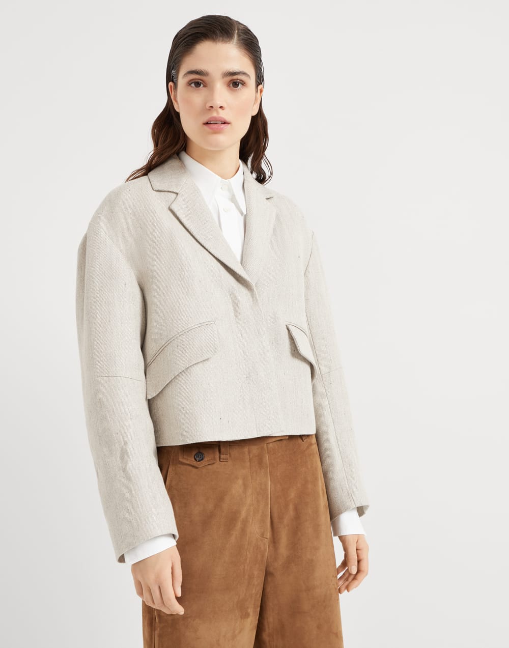 This linen cover outerwear jacket is inspired by the world of tailored blazers. The rustic linen texture and the slightly "cropped" cut are paired with the classic lapels and flap pockets for a refined mix of style. The concealed buttons closure creates an essential silhouette, while the shiny monili embroidery completes the jacket with a feminine sparkle in true Brunello Cucinelli style.