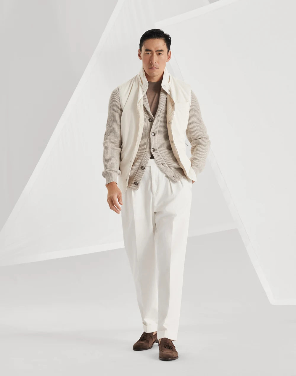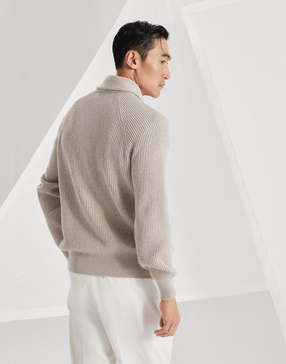 Refined materials with a distinct appearance enrich the versatile feel of this cardigan. The slightly irregular effect of cotton malfilé yarn enhances the iconic English rib knit texture with an elegant, lightweight touch. The shawl lapel and horn buttons closure is complemented by the raglan sleeve construction, a clever combination of classic and sporty elements.