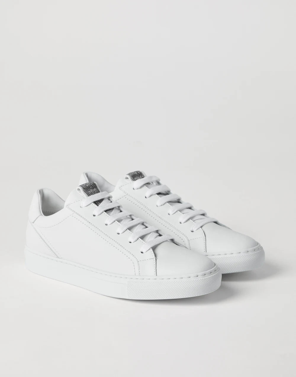 The sporty and essential allure of these Matte calfskin sneakers is enriched with the iconic embellishment of the Brunello Cucinelli collections. An insert entirely embroidered in thin rows of shiny monili stands out on the tongue, for a fine sparkling effect.