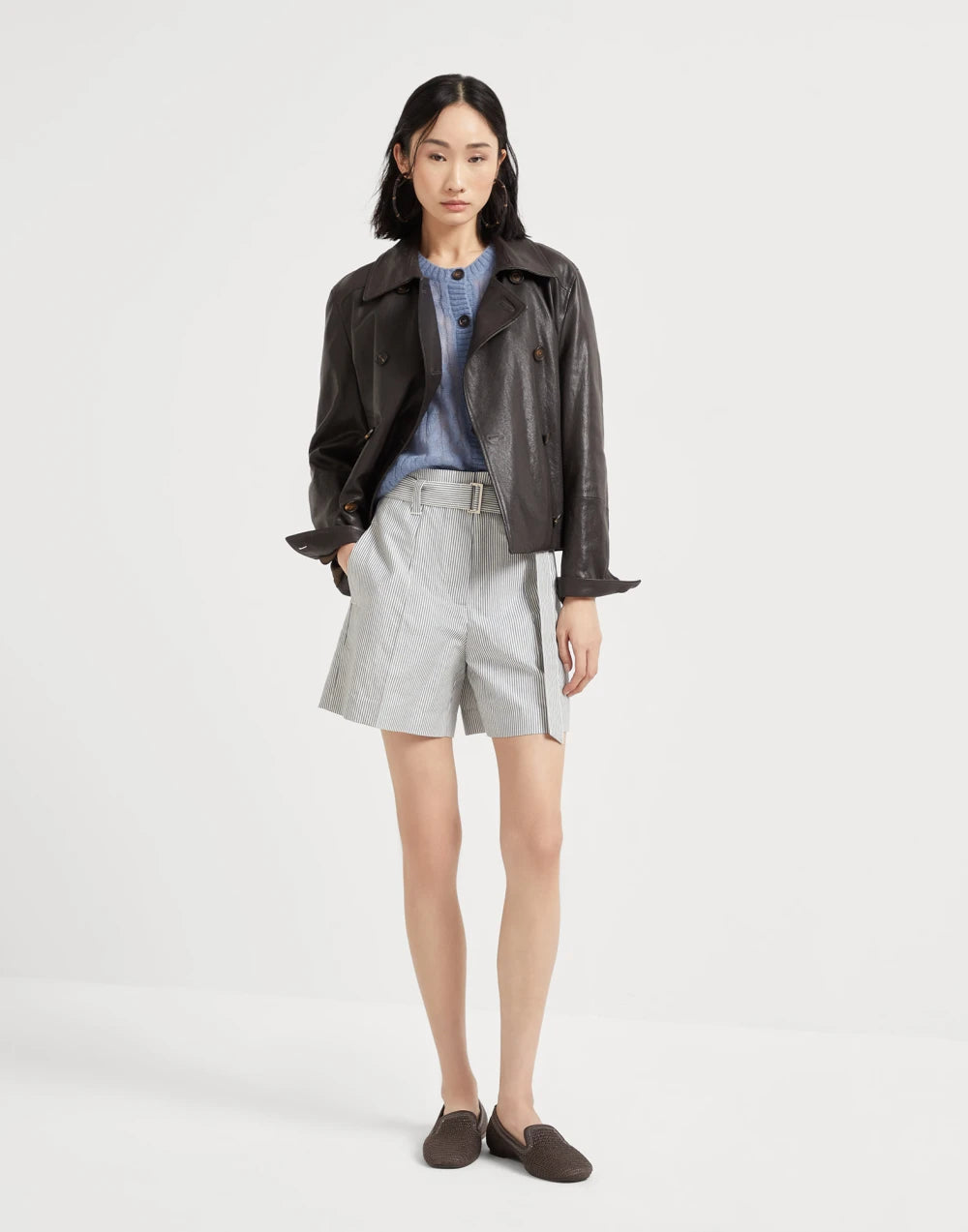 Refined Brunello Cucinelli materials define the essential, elegant feel of this mohair and wool cardigan. The blend of the two natural yarns creates a particularly lightweight garment with a slightly transparent, feminine effect. The timeless cable knitting gives the style an almost impalpable three-dimensional touch.