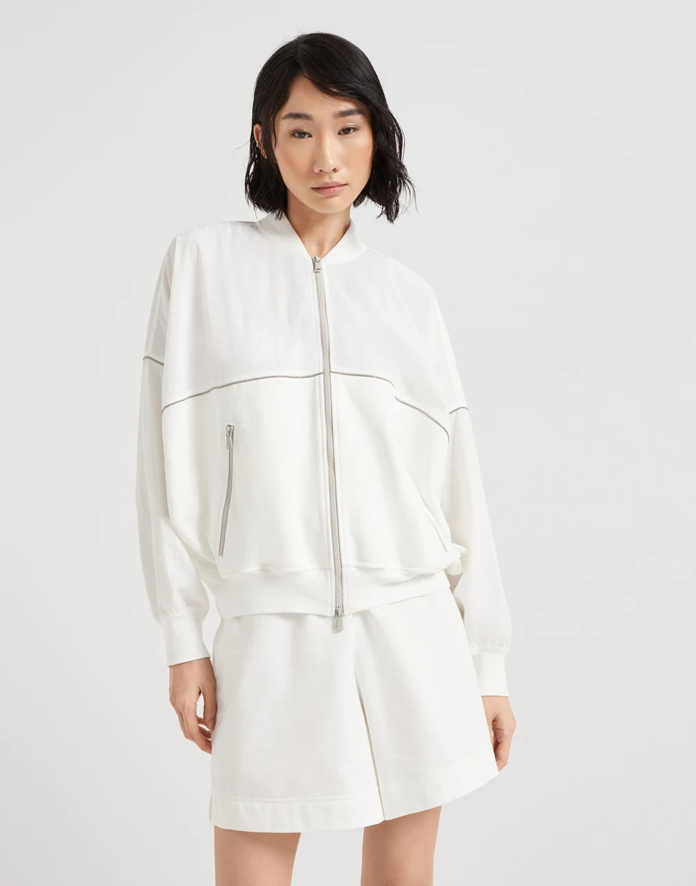 Paneled sweatshirt in cotton French terry and viscose wrinkled poplin with zipper and shiny trims
