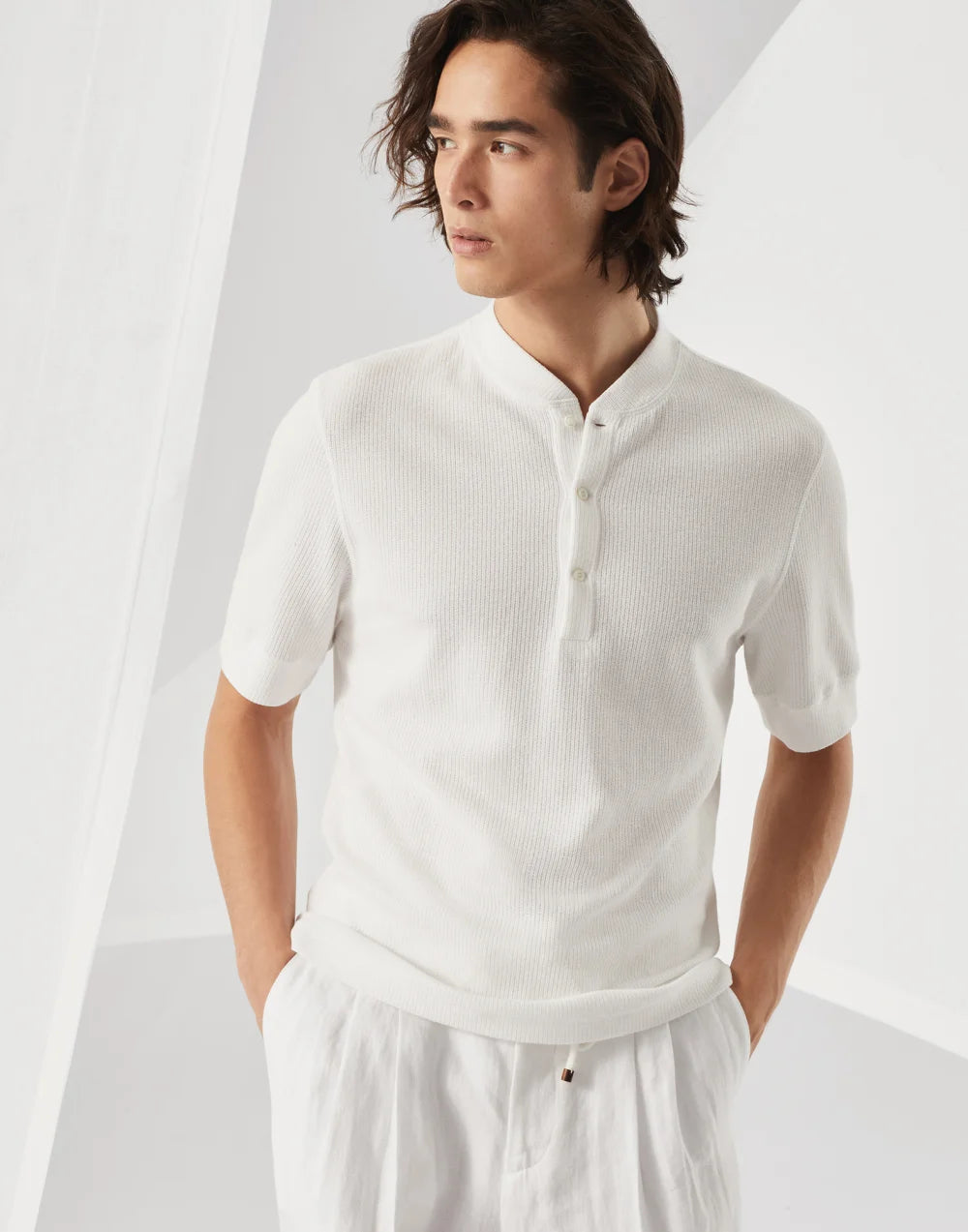 The blend of refined yarns enhances the casual, relaxed feel of this jersey T-shirt with henley collar. The fabric combines the light, fluid feel of cotton with the distinctive, slightly irregular appearance of linen, highlighting the garment’s ribbing. The short-sleeve silhouette offers regular, comfortable proportions.
