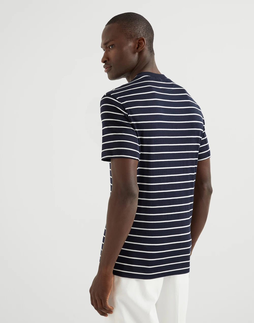 The excellence of Brunello Cucinelli’s natural yarns enriches the casual, relaxed style of this silk and cotton jersey T-shirt. The fabric is enhanced by a striped pattern detailed in the season’s colors, a delicate balance between the compact lightness of cotton and the sheen of the silk fibers. The crew-neck design with a regular, comfortable fit is completed by the chest pocket.