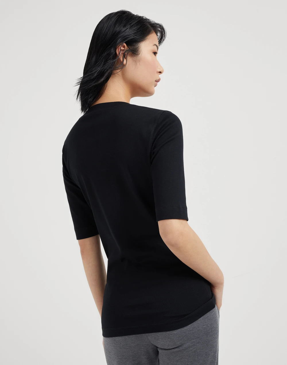 The iconic embellishment of the Brunello Cucinelli collections elevates the minimal style of this new ribbed stretch cotton jersey T-shirt. Its V-neck is enriched with a precious contrasting monili insert that gives the garment a radiant sparkle. The three-quarter sleeves and slightly fitted lines define the silhouette.