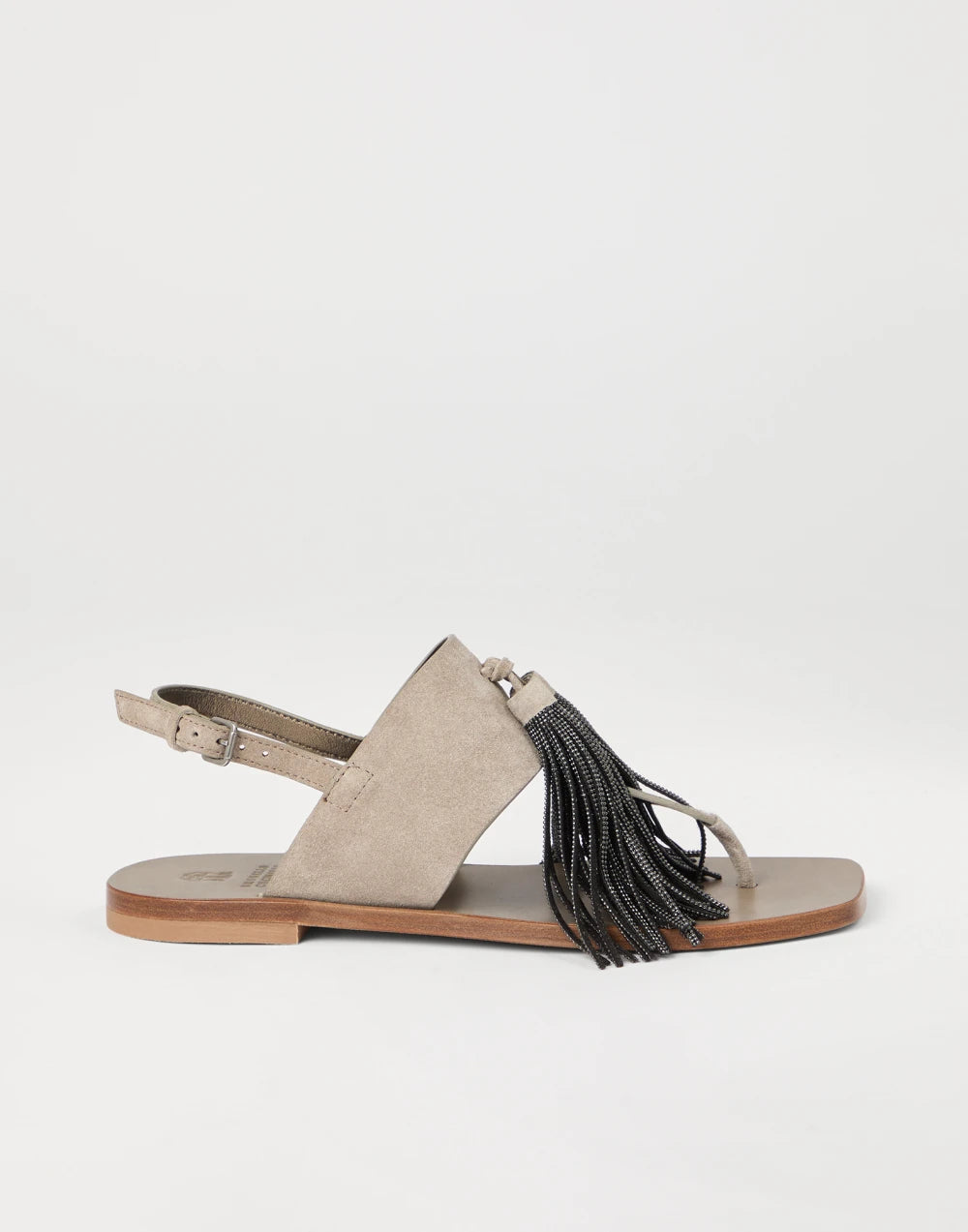 An essential feel is paired with Brunello Cucinelli’s refined materials and elegant details in these suede sandals. Lightweight and contemporary in shape, the outsole showcases the leather’s typical velvety texture, while the oversized fringes are illuminated with a shiny monili embroidery that gives the footwear a feminine sparkle.