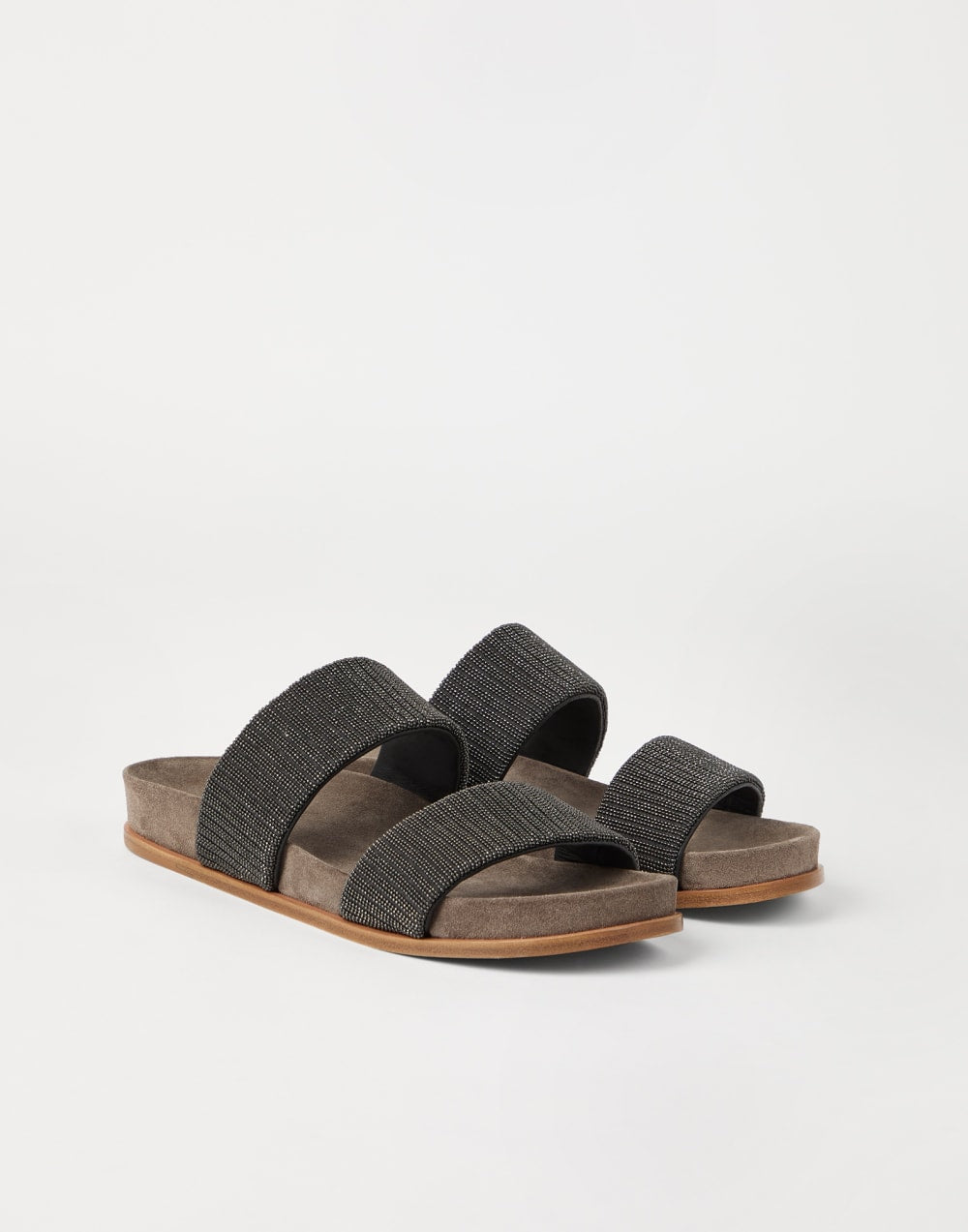 Contemporary, urban styling characterizes these new suede slides. The shoes feature two straps entirely embroidered in monili, the iconic decoration of the Brunello Cucinelli collections, which add a radiant, sparkling touch to the design.