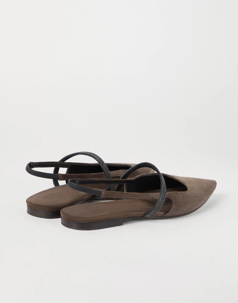 A precious aesthetic, a contemporary design and sparkling details define these suede flats. This special leather gives a smooth and velvety appearance to the shoes, which elegantly pairs with their sinuous lines. The thin strap on the instep is brightened up by a shiny monili embroidery that enhances the feminine and stylish feel of the footwear.