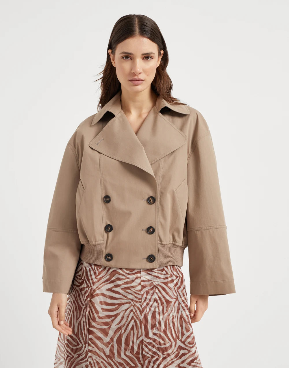 Timeless elegance and contemporary lines define the style of this new cotton panama Crop caban jacket. Characterized by a double-breasted closure and a straight silhouette, the garment features stylish yet functional details that enrich the design’s versatile feel. The shiny monili embroidery completes the caban jacket with a radiant sparkle in true Brunello Cucinelli style.