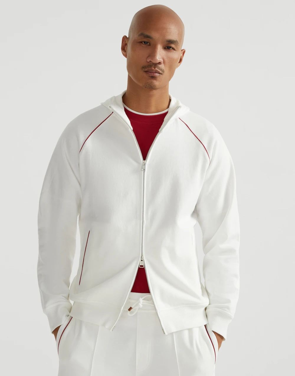 Techno cotton French terry hooded sweatshirt with zipper and piping