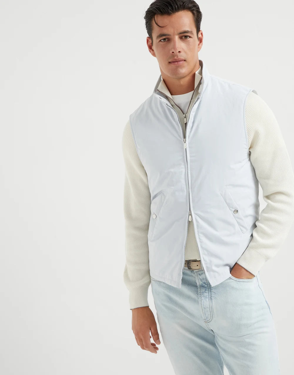 Modern, innovative materials provide function and performance to this water-resistant microfiber vest, which showcases a simple, essential silhouette. The garment incorporates the classic codes of casual outerwear, with a throat latch, zipper closure and side pockets. The surface of the fabric is smooth and silky, while the lightweight Thermore® padding on the inside provides warmth and protection.